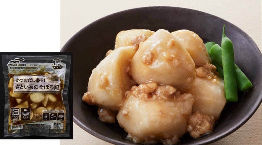 ほくほくした手切りの里芋に、かつおだしの効いた甘辛い豚そぼろの餡が良く絡んでいます。