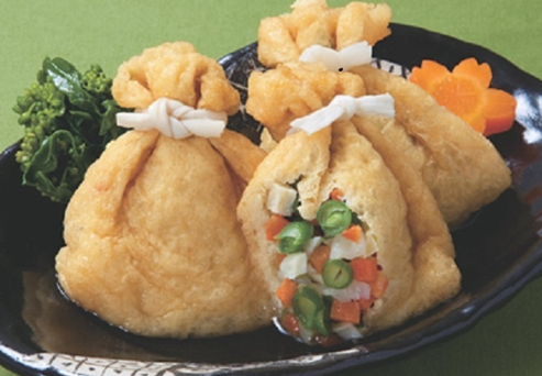 油揚げの巾着の中に、細かく刻んだ5種の野菜(いんげん・たけのこ・人参・キャベツ・椎茸)を詰めました。