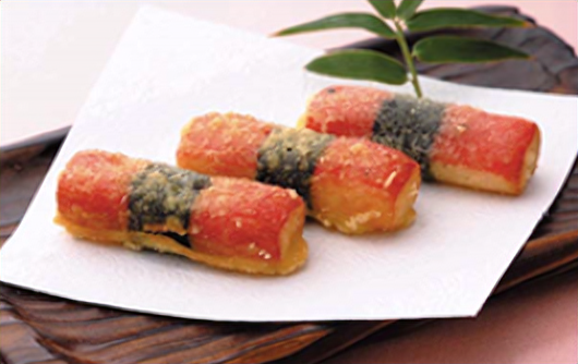 赤いかに風味かまぼこと、黒い海苔のコントラストが目を引く磯部フリッター。